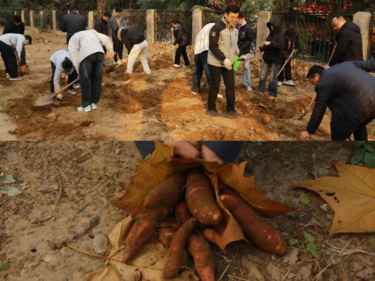 活动中,党员教师躬身示范,学生们积极跟进,一起动手挖红薯、清整劳动基地环境。大家手持工具,分工协作,有序开展挖薯、清泥、装袋等工作。随着一垄垄泥土翻开,一个个红薯破土而出,田间地头充满着欢声笑语,每个人的脸上都洋溢着收获的喜悦。在收获红薯的同时,师生们还对劳动基地周边落叶、杂物进行彻底清理,进一步优化了“百荟园”实践环境。劳动间歇,教师们还结合农业生产实际,向学生讲解作物生长规律与劳动价值,分享“劳动育人、实践成才”的体会,在共同流汗中深化了思想交流与情感联结。