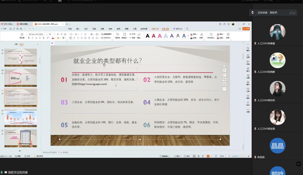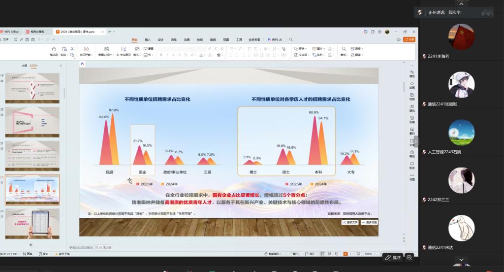 培训中,郅宏宇老师围绕三大核心内容展开讲解。在就业政策解读方面,详细介绍选调生、特岗教师、参军入伍等基层就业项目的报考条件与优待政策,提醒同学们关注郑州等地的人才补贴、安家费等支持政策;在就业信息指导方面,系统讲解了央国企、大型民企、三资企业等六大类就业企业类型及占比特点,指导同学们通过学校就业网、国聘网、boss直聘等专业招聘平台等权威渠道收集分析企业信息;在风险防范方面,重点警示了偷税漏税、拖欠工资等就业陷阱,引导毕业生维护自身的合法权益。