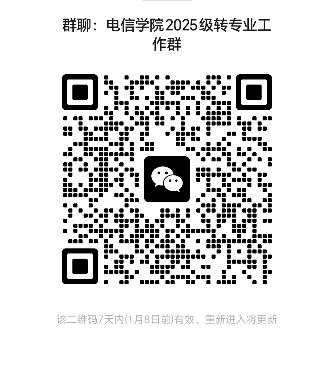 请资格审核通过的学生在2026年1月4日中午12:00之前扫描电信学院2025级转专业工作群二维码进群,逾期未进群者,视为自动放弃转专业资格。